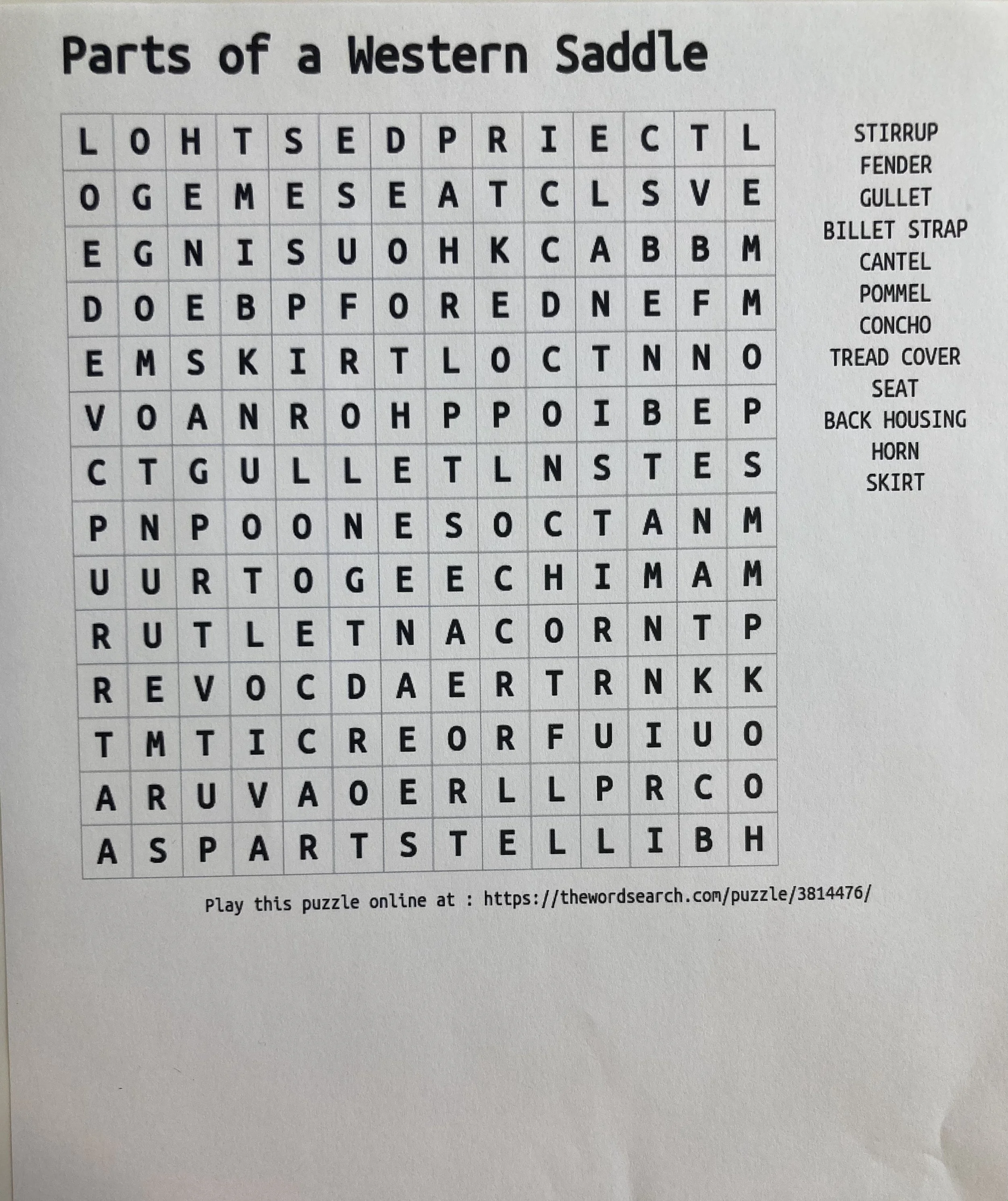 Skylar wasn’t able to join in on the Saddle Fitting clinic but she really enjoys word finding puzzles and hopes that others will enjoy her puzzles too.