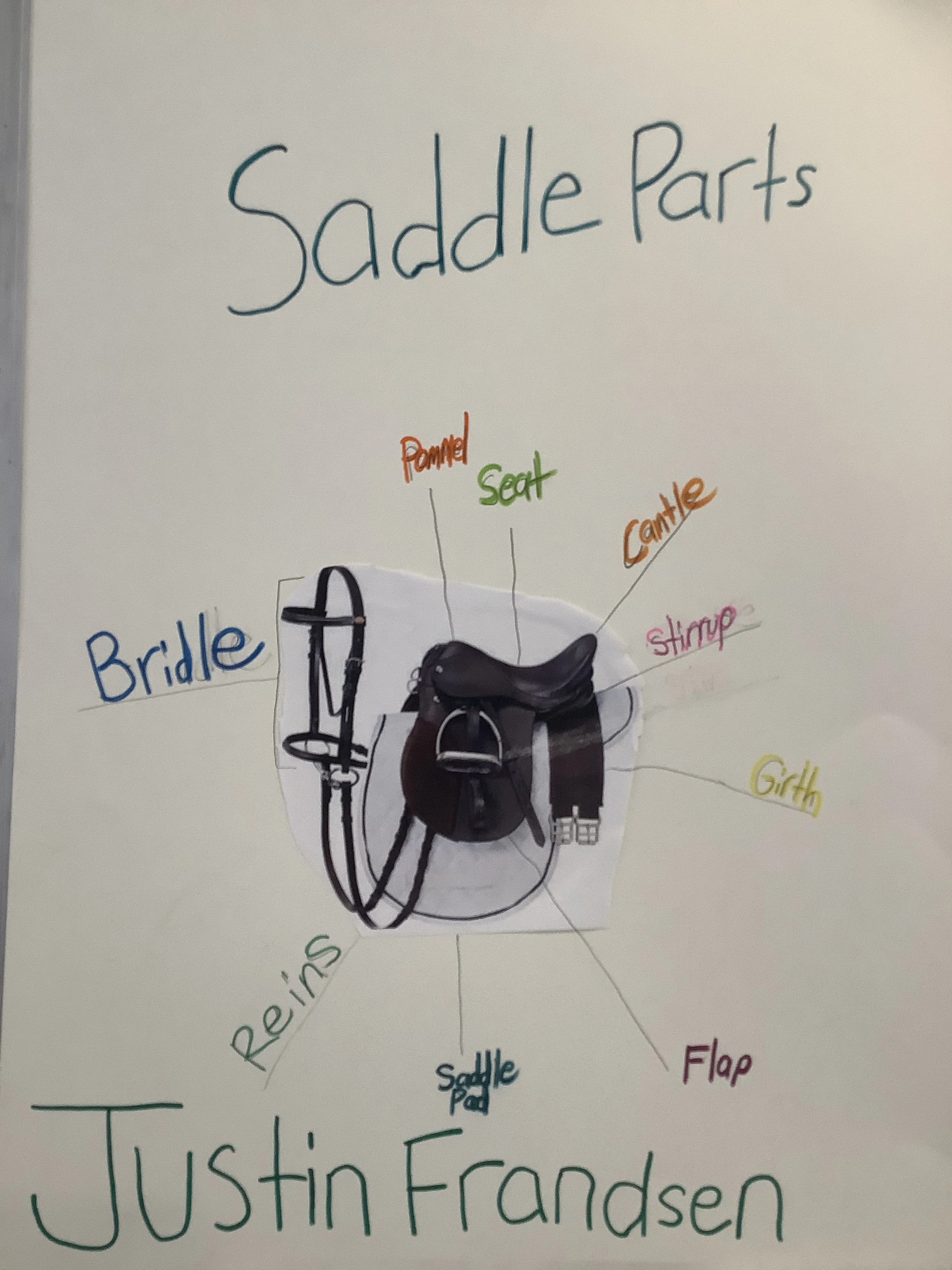 Justin’s favorite part of the clinic was seeing the types of saddle pads and how to use them to make the saddle fit right. Justing liked labeling the parts of the saddle for his project.