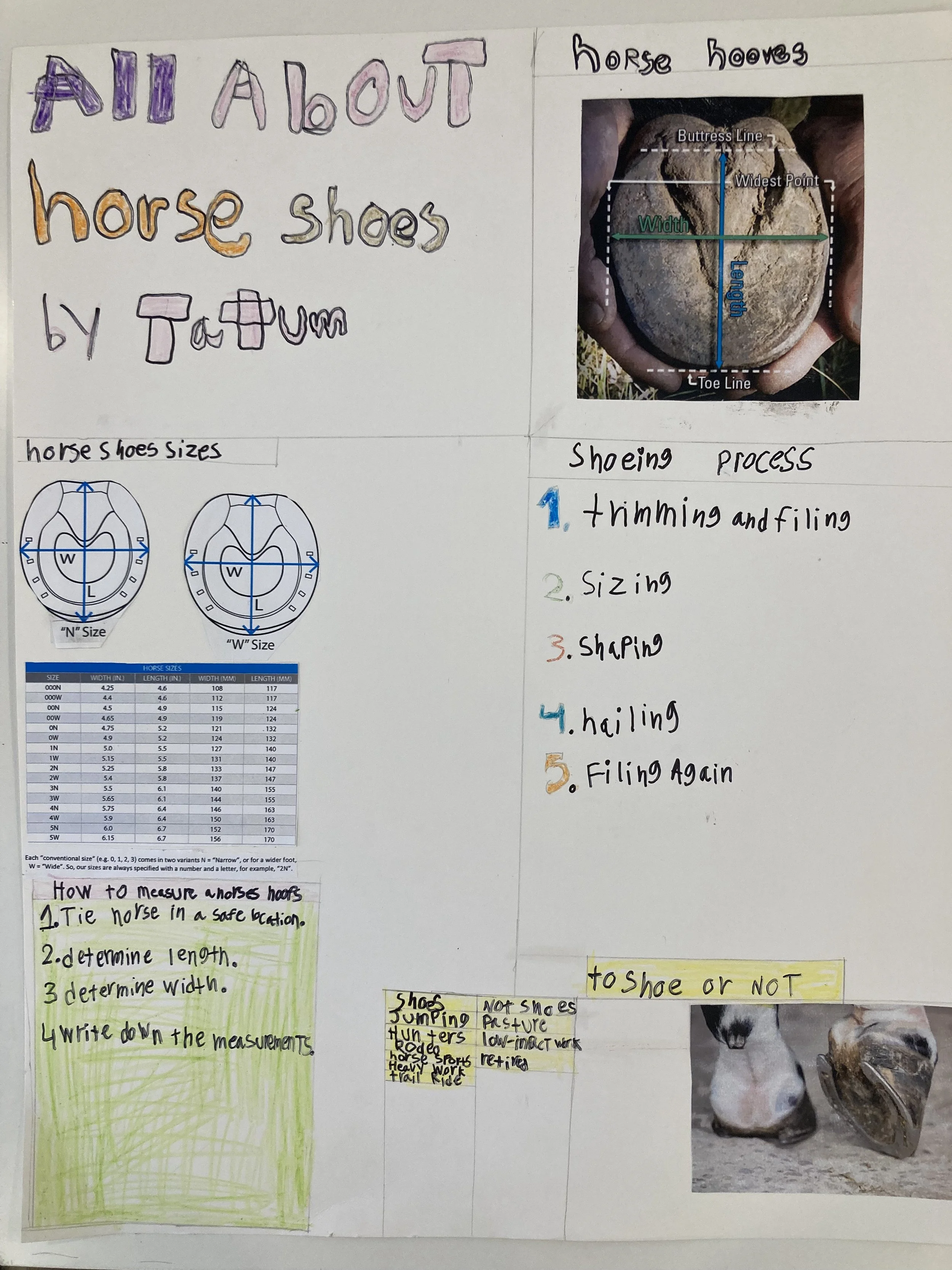 Tatum didn’t get to participate in the clinic but she did research the topic. Tatum enjoyed learning if horses have to wear shoes or not as well as the whole shoeing process.