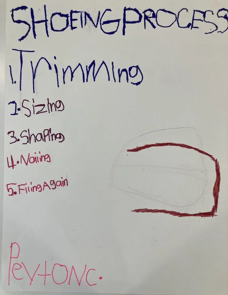 Emma really liked watching Jack the Farrier put Sisu’s shoe back on. Emma’s favorite part of her project was drawing it.