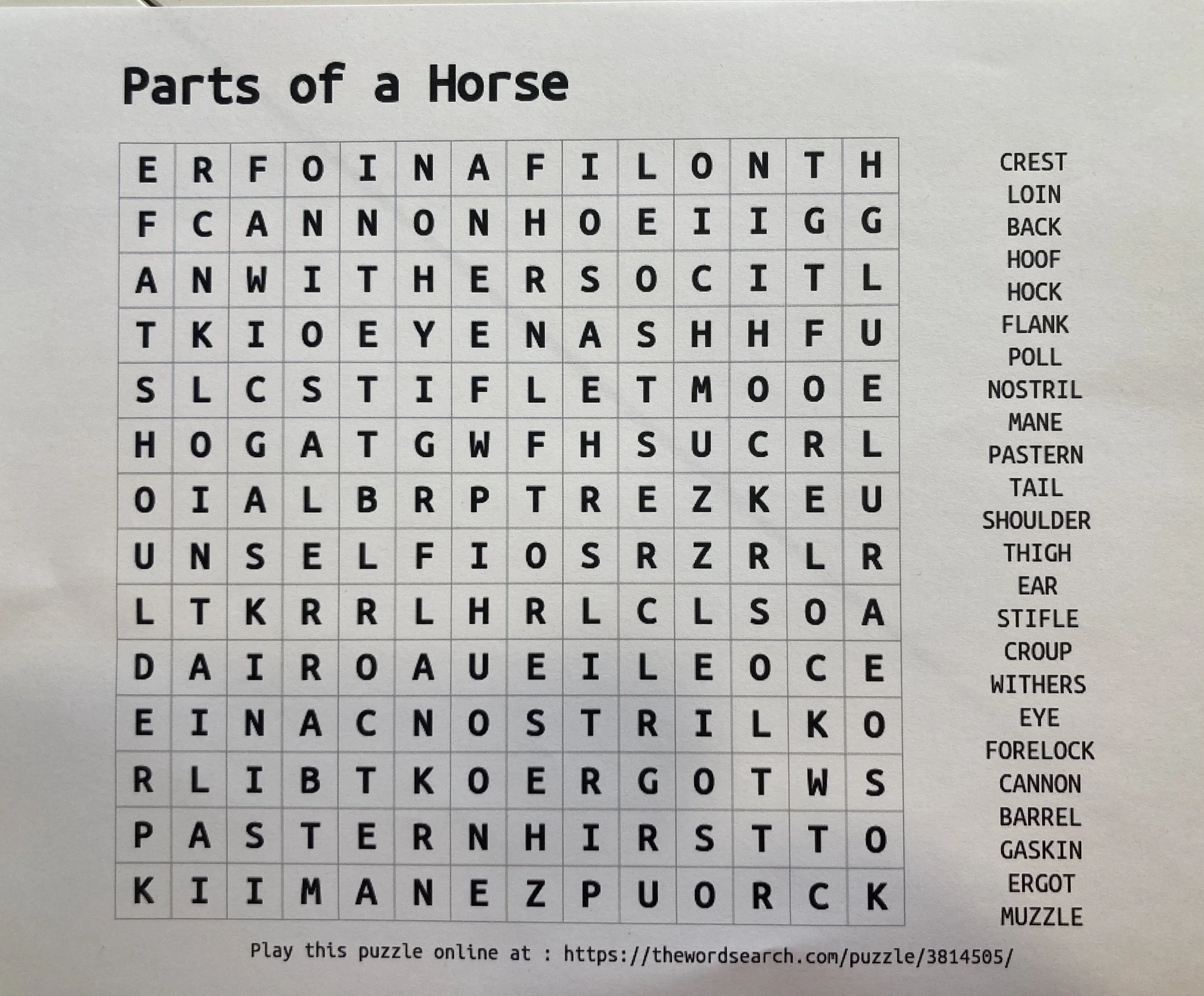 Skylar thought the clinic was awesome. The way John the Farrier put the shoes on, shaped the shoe with heat, and learning about the job in general. The amount of money they can make was cool to learn about too. Skylar’s favorite part of her cross-word puzzle was the process of looking at pictures, remembering the word, and then typing the work into puzzle bank.