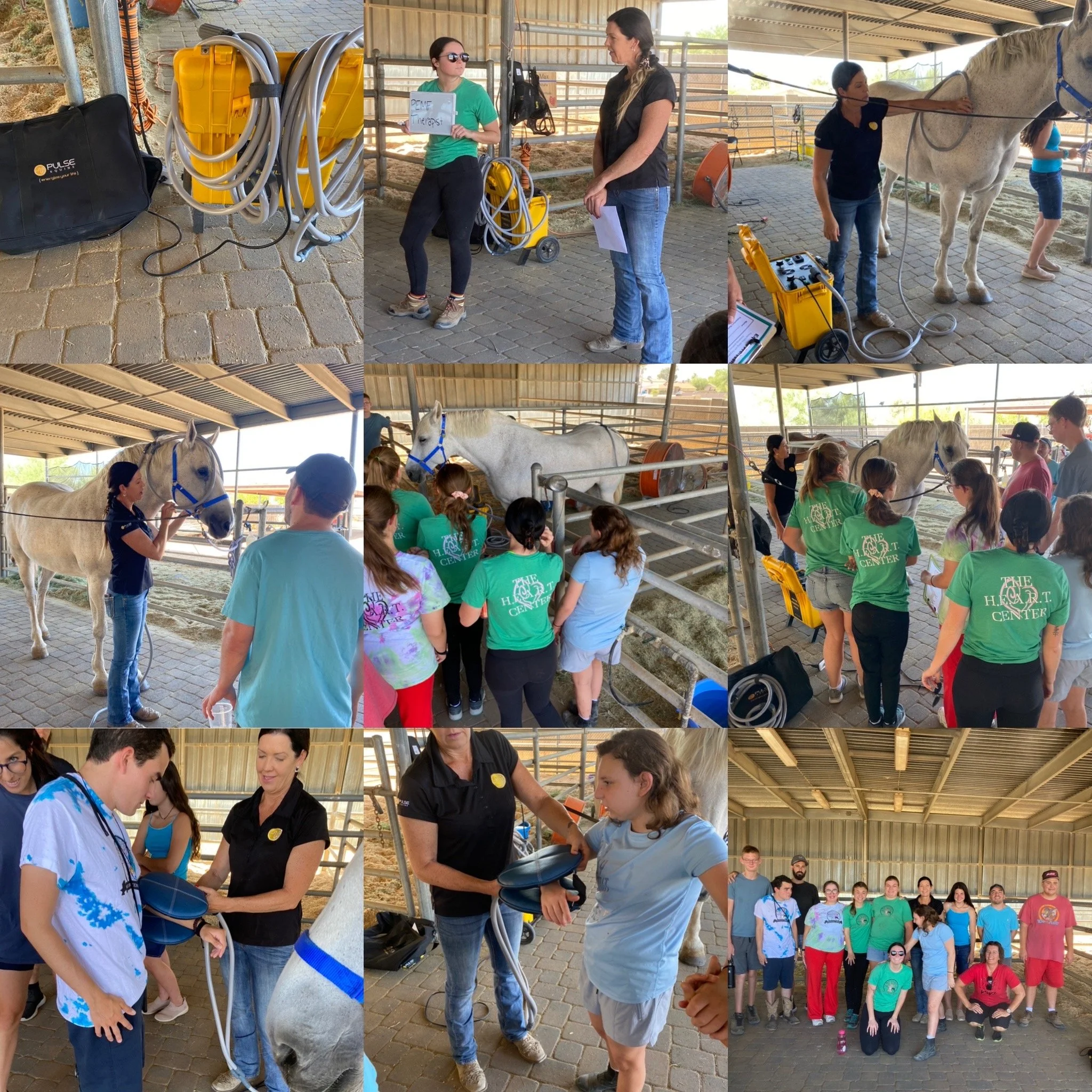 Group of people participating in a horse therapy session at an outdoor covered arena. The images include people training, handling, and interacting with horses, with some students sitting and listening, and others learning about horse care and riding